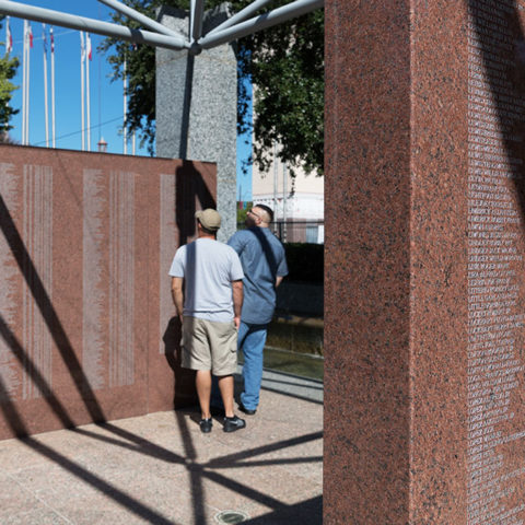 Paying tribute to our brave veterans, five tablets of Texas granite are inscribed with the names of Texans killed or missing in action during the Vietnam War. Visitors can place American flags next to the names of soldiers they wish to honor. Nine recipients of the Congressional Medal of Honor are among those memorialized. The inscriptions include Congressional Medal of Honor recipients.